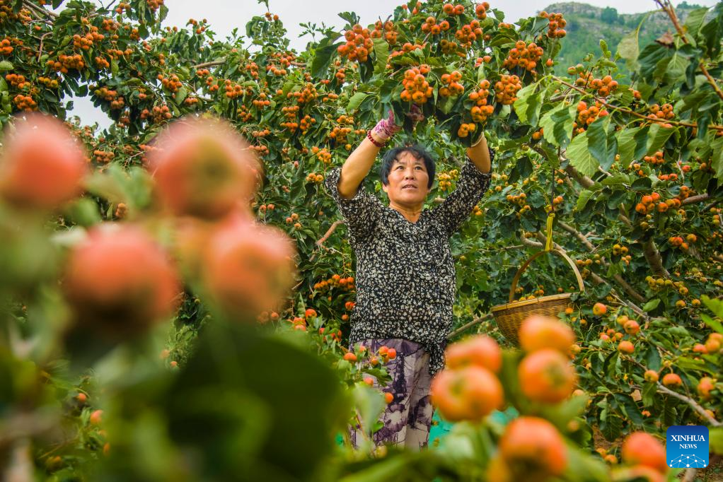 A villager picks hawthorns in Shuiquan Town of Shanting District in Zaozhuang City, east China's Shandong Province, Sept. 11, 2025. (Photo by Liu Mingxiang/Xinhua)