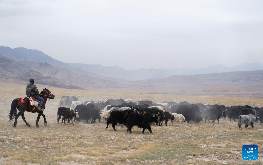 A herder drives his livestock to leave the summer pasture in Dulan County, the Mongolian-Tibetan Autonomous Prefecture of Haixi, northwest China's Qinghai Province, Sept. 9, 2025. Recently, herders in Dulan County have begun their autumn-winter migration. For centuries, herders living in the Qaidam Basin have carried out seasonal migrations twice a year to maintain a balance between the vitality of the grasslands and the growth of their livestock. This year, about 1.23 million head of livestock in Dulan County are expected to take part in migrations, which are scheduled to conclude by mid-October. (Xinhua/Qi Zhiyue)