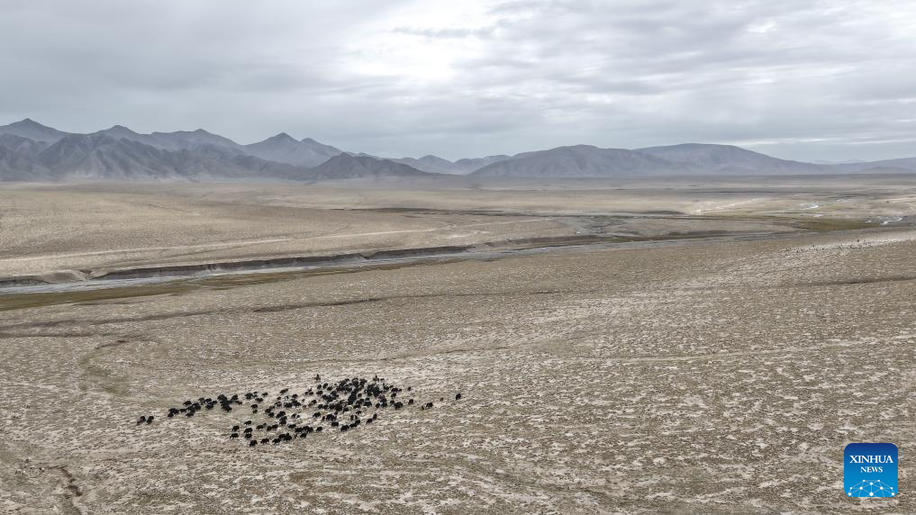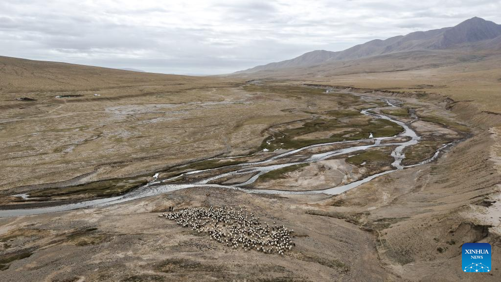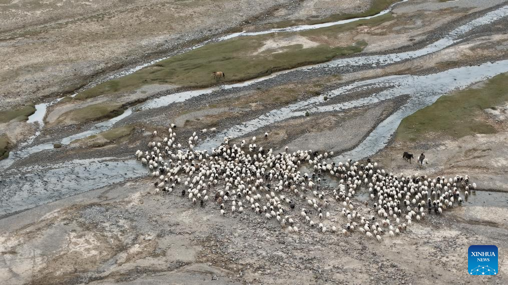 An aerial drone photo shows herders driving their livestock to leave the summer pasture in Dulan County, the Mongolian-Tibetan Autonomous Prefecture of Haixi, northwest China's Qinghai Province, Sept. 9, 2025. Recently, herders in Dulan County have begun their autumn-winter migration. For centuries, herders living in the Qaidam Basin have carried out seasonal migrations twice a year to maintain a balance between the vitality of the grasslands and the growth of their livestock. This year, about 1.23 million head of livestock in Dulan County are expected to take part in migrations, which are scheduled to conclude by mid-October. (Xinhua/Qi Zhiyue)