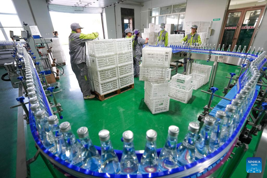 A staff member displays birch water products at a birch sap processing company in Yichun, northeast China's Heilongjiang Province, Sept. 10, 2025. (Xinhua/Wang Jianwei)