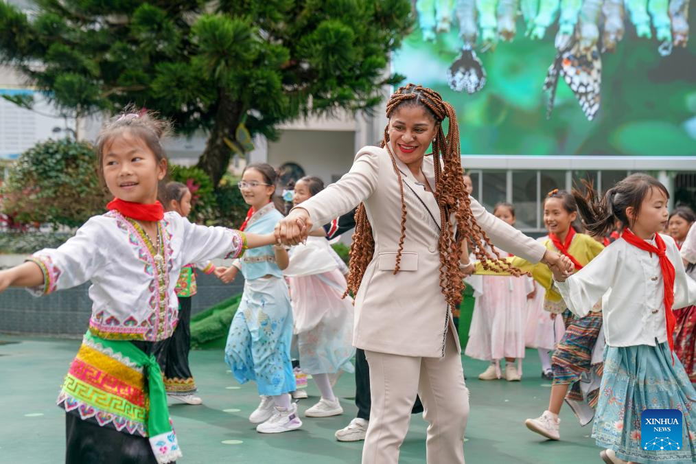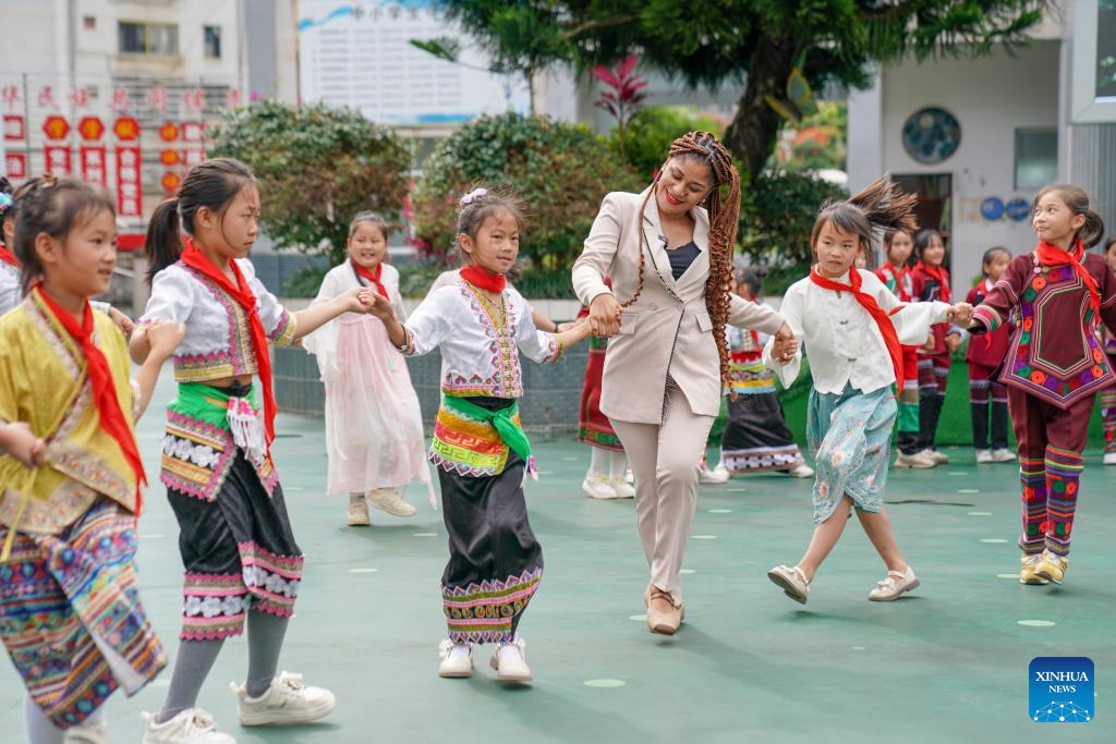 Milagrosa Ada Micha Abeso, an Equatorial Guinean journalist, dances with children at the China-Equatorial Guinea Friendship Primary School in Jinping Miao, Yao and Dai Autonomous County, southwest China's Yunnan Province, Sept. 9, 2025. (Xinhua/Peng Yikai)