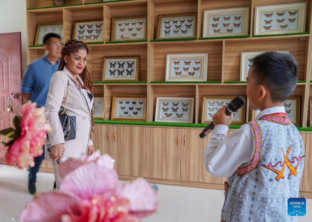 A student shows Milagrosa Ada Micha Abeso, an Equatorial Guinean journalist, the exhibits of the China-Equatorial Guinea Friendship Primary School in Jinping Miao, Yao and Dai Autonomous County, southwest China's Yunnan Province, Sept. 9, 2025. (Xinhua/Peng Yikai)