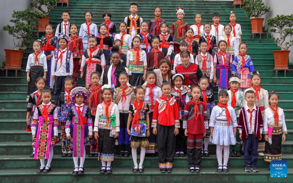 Milagrosa Ada Micha Abeso (C), an Equatorial Guinean journalist, poses for a group photo at the China-Equatorial Guinea Friendship Primary School in Jinping Miao, Yao and Dai Autonomous County, southwest China's Yunnan Province, Sept. 9, 2025. (Xinhua/Peng Yikai)