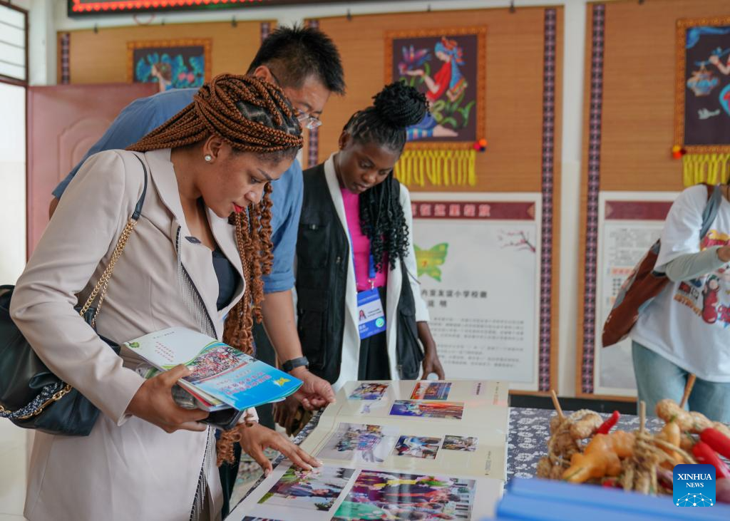 Milagrosa Ada Micha Abeso (front), an Equatorial Guinean journalist, views photos at the China-Equatorial Guinea Friendship Primary School in Jinping Miao, Yao and Dai Autonomous County, southwest China's Yunnan Province, Sept. 9, 2025. (Xinhua/Peng Yikai)