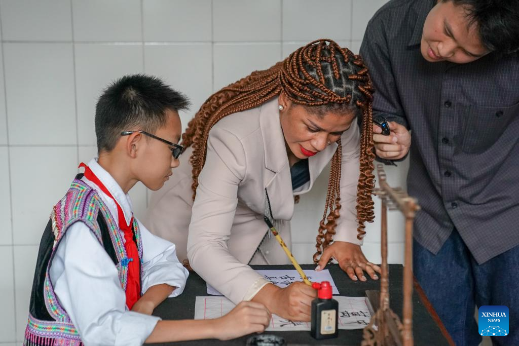 Milagrosa Ada Micha Abeso, an Equatorial Guinean journalist, writes Chinese calligraphy at the China-Equatorial Guinea Friendship Primary School in Jinping Miao, Yao and Dai Autonomous County, southwest China's Yunnan Province, Sept. 9, 2025. (Xinhua/Peng Yikai)