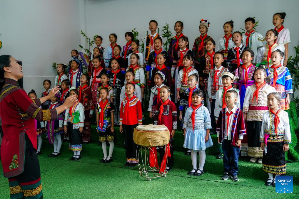 Children greet Milagrosa Ada Micha Abeso, an Equatorial Guinean journalist, with songs at the China-Equatorial Guinea Friendship Primary School in Jinping Miao, Yao and Dai Autonomous County, southwest China's Yunnan Province, Sept. 9, 2025. (Xinhua/Peng Yikai)