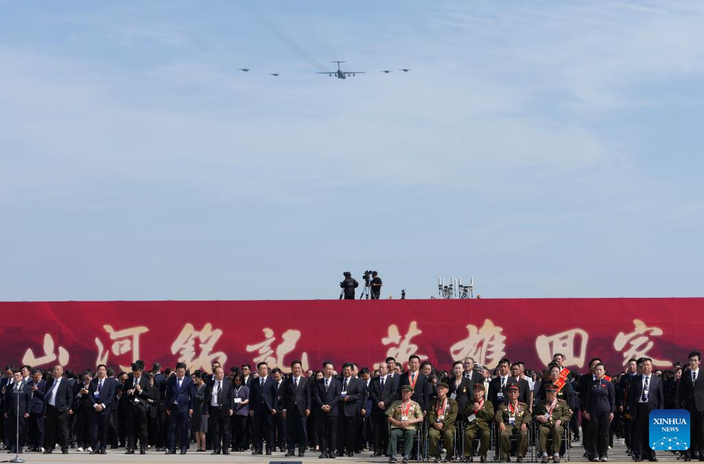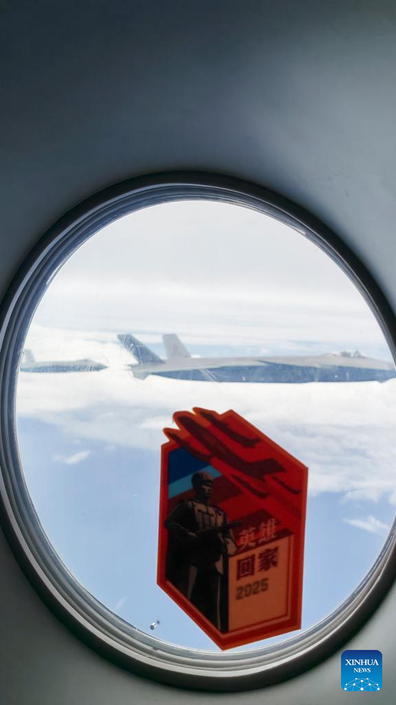 A Chinese People's Liberation Army (PLA) Air Force Y-20 transport aircraft carrying the remains of Chinese People's Volunteers (CPV) martyrs, escorted by four J-20 fighter jets, is pictured in Shenyang, capital of northeast China's Liaoning Province, on Sept. 12, 2025. The remains of 30 Chinese People's Volunteers (CPV) soldiers who lost their lives during the War to Resist U.S. Aggression and Aid Korea (1950-1953) were returned to China on Friday from the Republic of Korea (ROK). (Xinhua/Pan Yulong)