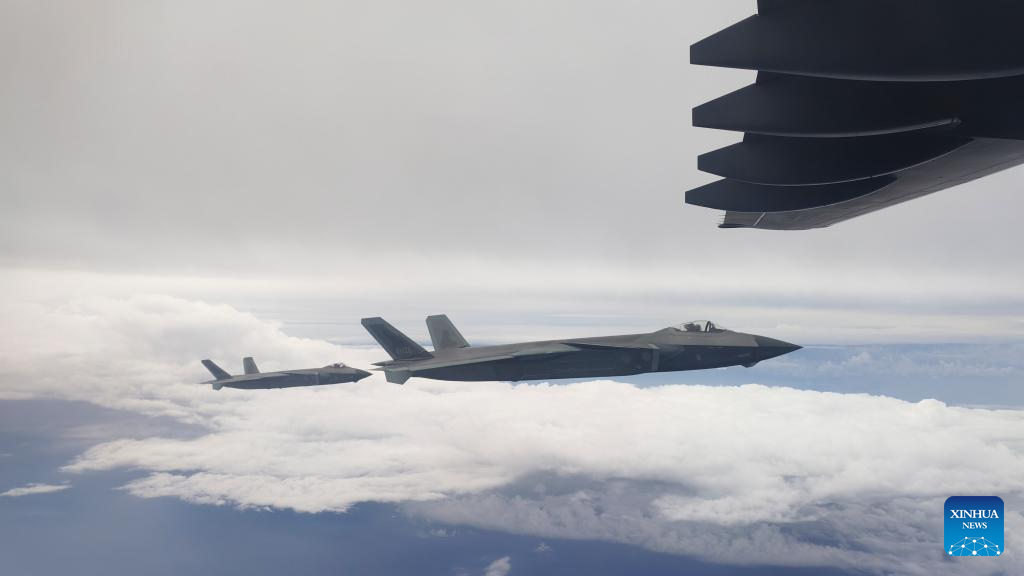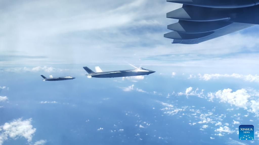 Two J-20 fighter jets of the Chinese People's Liberation Army (PLA) Air Force escort a Y-20 transport aircraft carrying the remains of Chinese People's Volunteers (CPV) martyrs on Sept. 12, 2025. The remains of 30 Chinese People's Volunteers (CPV) soldiers who lost their lives during the War to Resist U.S. Aggression and Aid Korea (1950-1953) were returned to China on Friday from the Republic of Korea (ROK). (Photo by Xiao Hang/Xinhua)