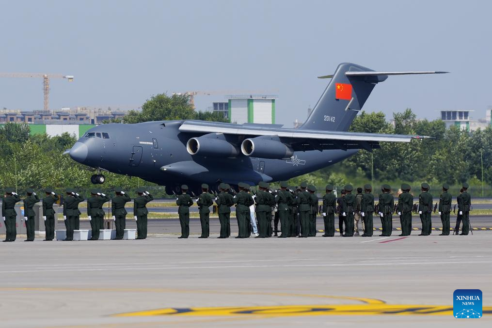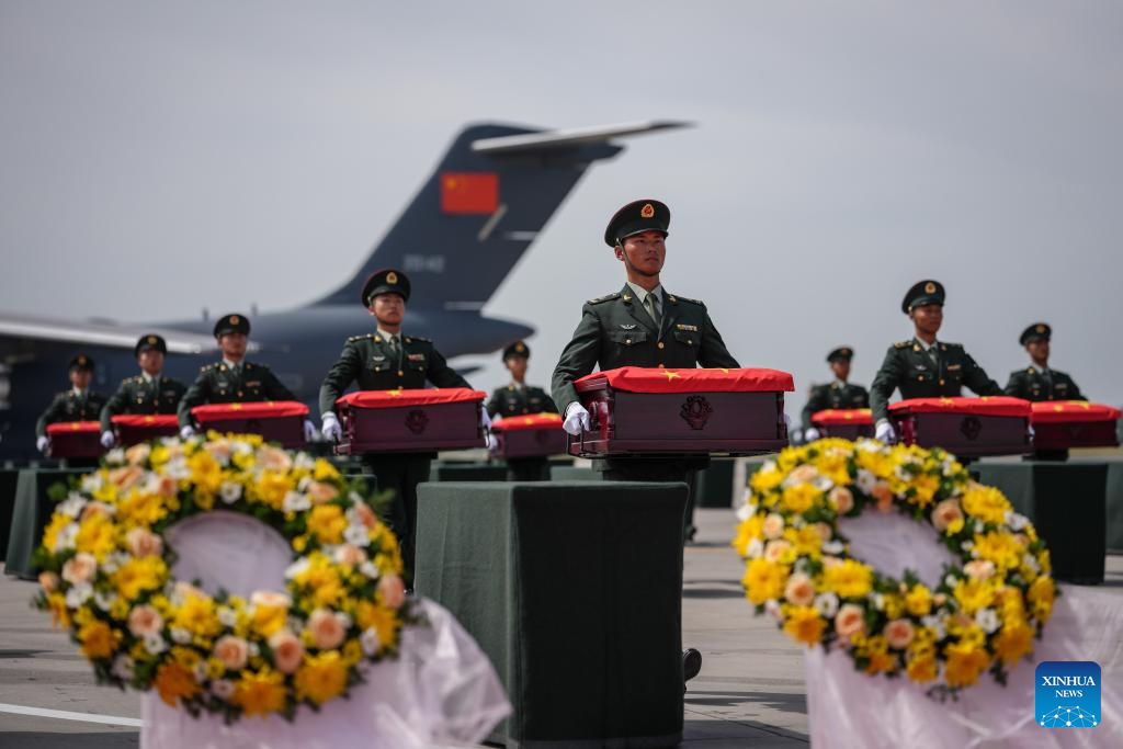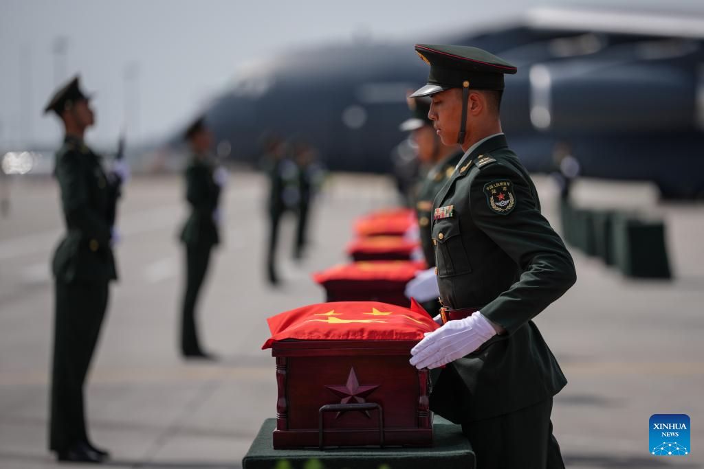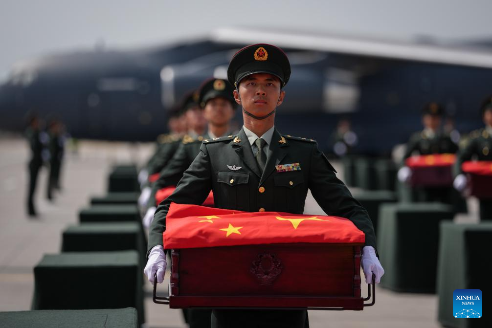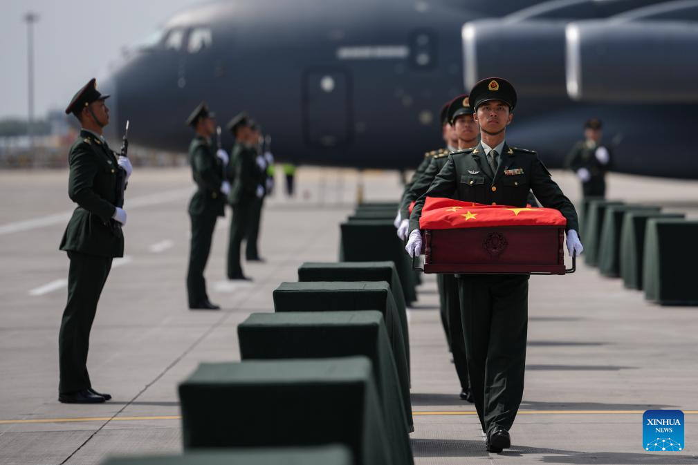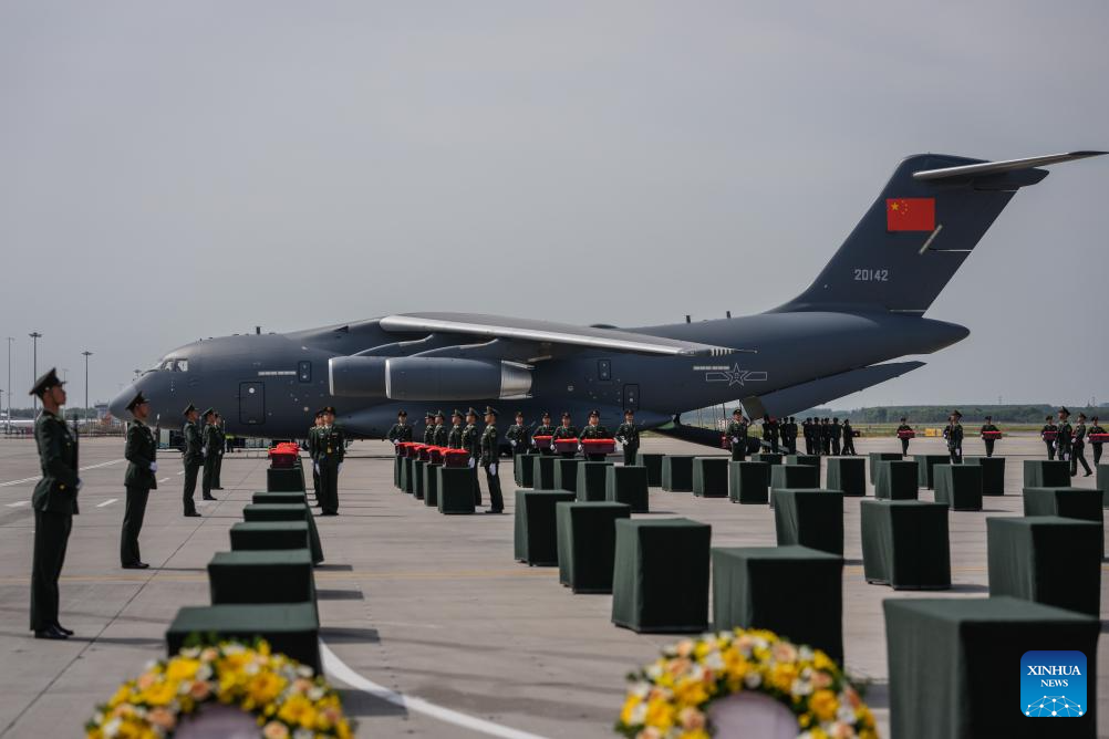 A Chinese People's Liberation Army Air Force Y-20 transport aircraft, carrying the remains of the martyrs and 267 items of related artifacts, landed at Taoxian International Airport in Shenyang, capital of northeast China's Liaoning Province.