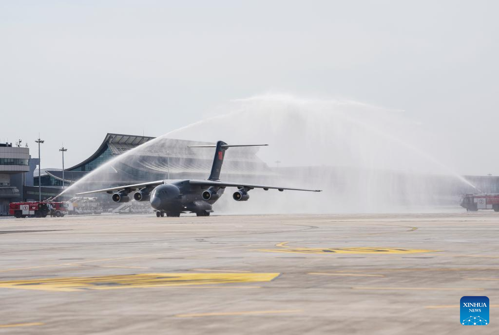 A Y-20 transport aircraft carrying the remains of Chinese People's Volunteers (CPV) martyrs passes through a water gate at Taoxian International Airport in Shenyang, northeast China's Liaoning Province, on Sept. 12, 2025. The remains of 30 Chinese People's Volunteers (CPV) soldiers who lost their lives during the War to Resist U.S. Aggression and Aid Korea (1950-1953) were returned to China on Friday from the Republic of Korea (ROK). (Xinhua/Pan Yulong)