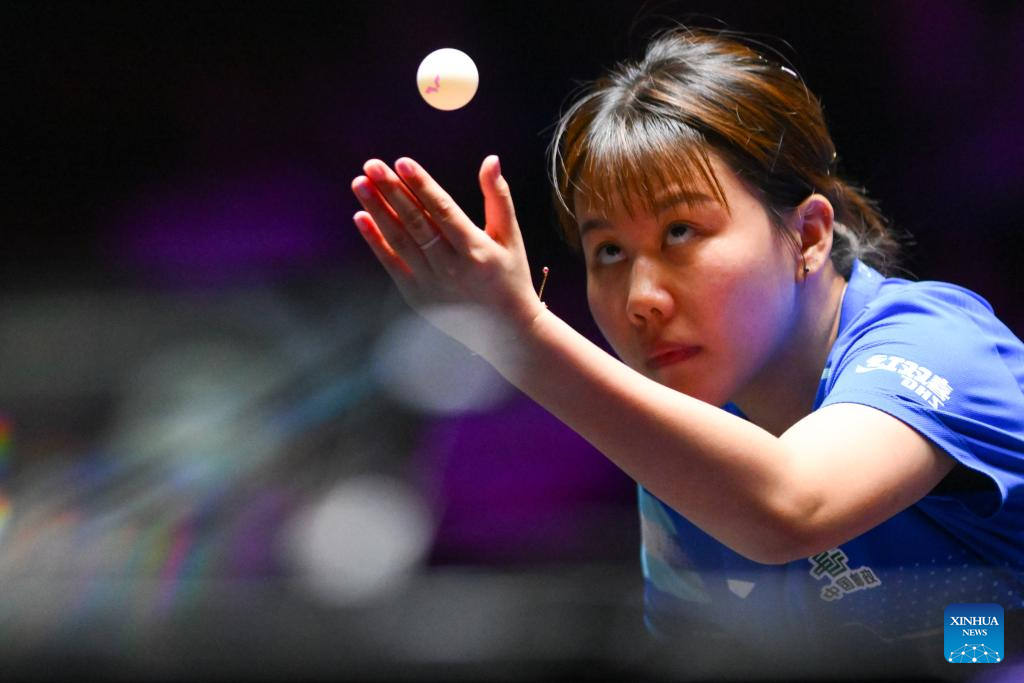 Doo Hoi Kem of China's Hong Kong serves during the women's singles round of 16 match against Chen Xingtong of China at the 2025 World Table Tennis (WTT) Champions Macao in Macao, south China, Sept. 12, 2025. (Xinhua/Cheong Kam Ka)