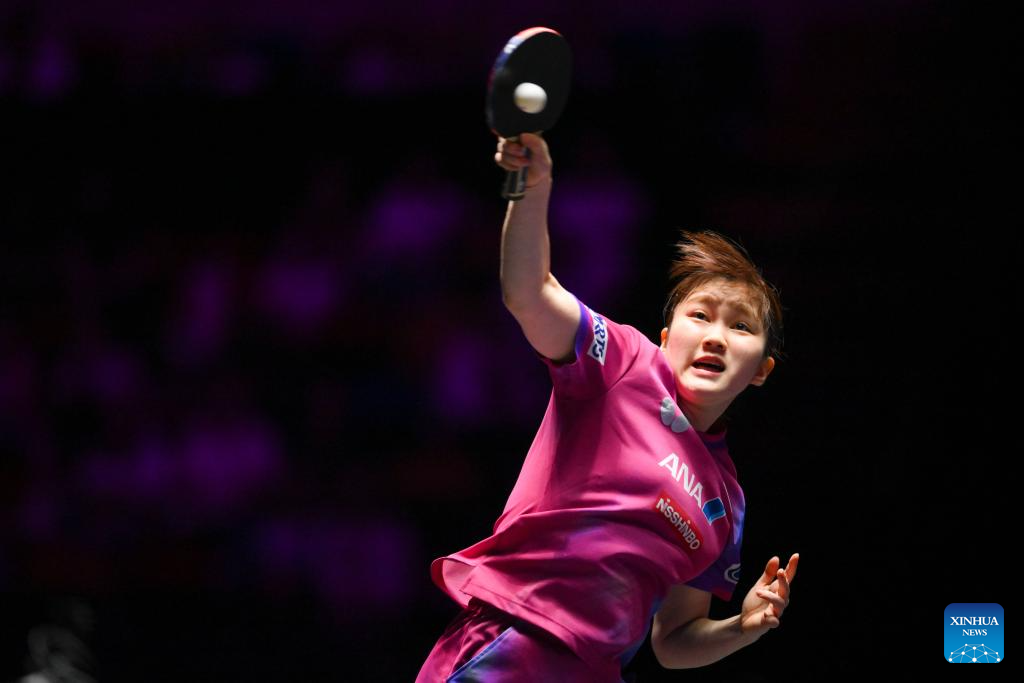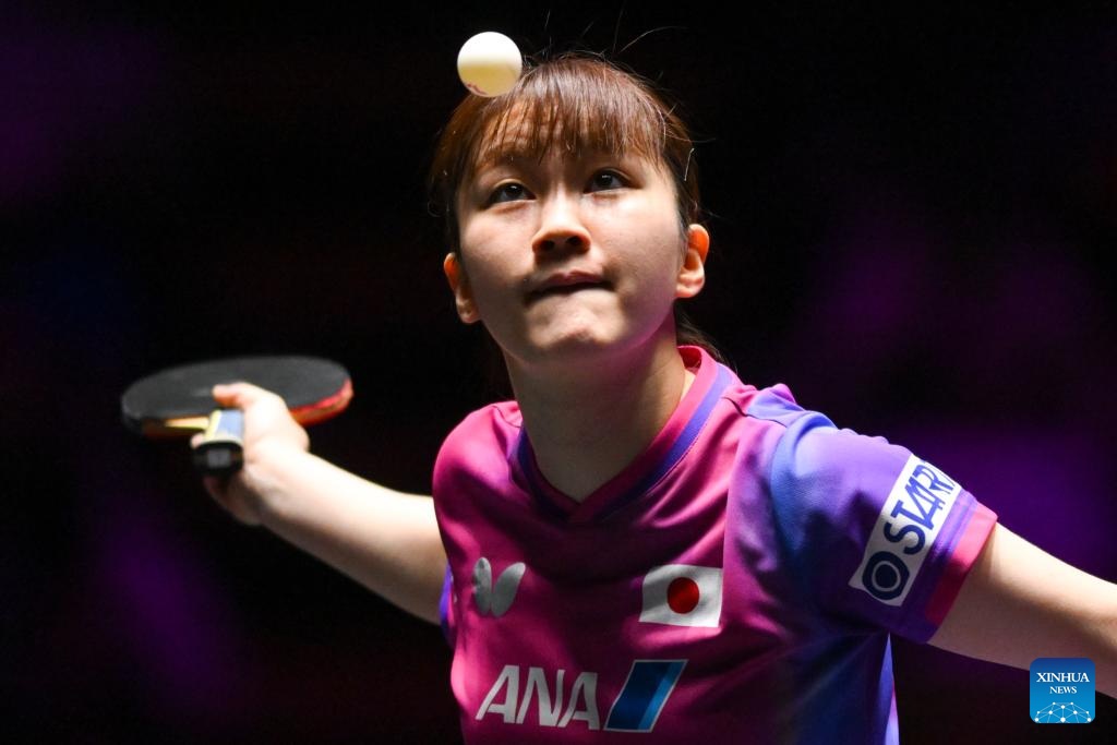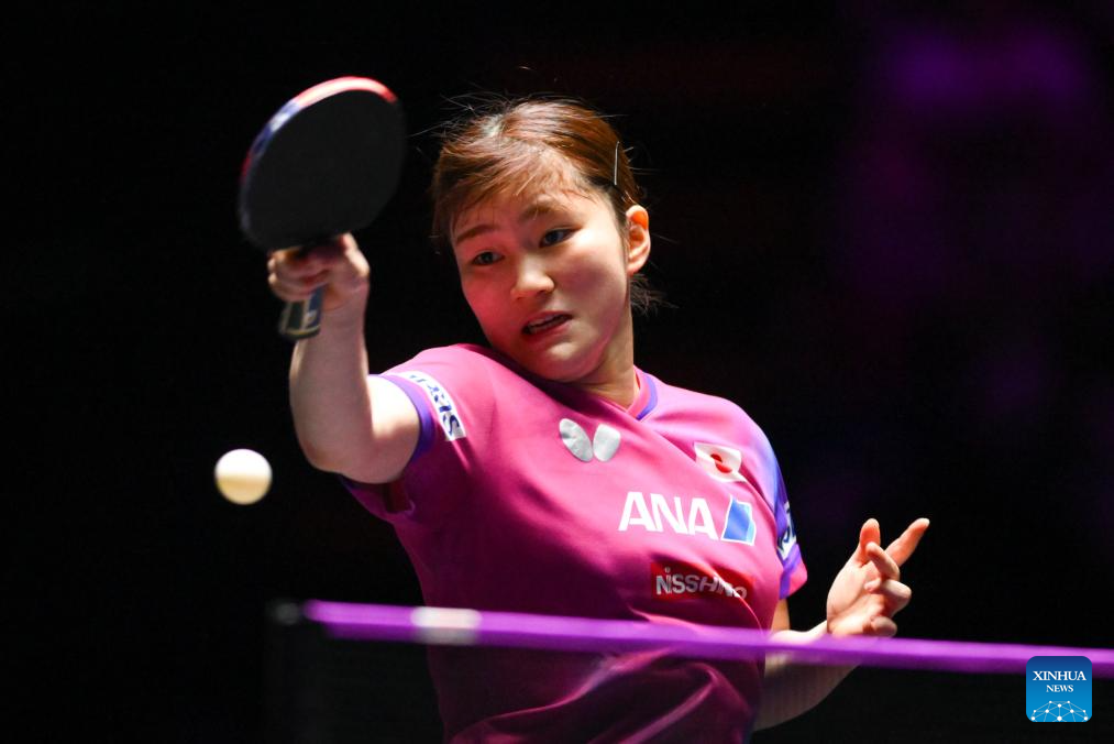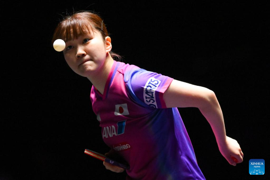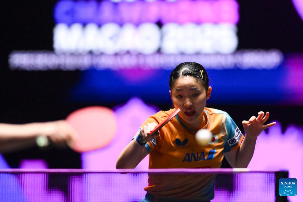 Odo Satsuki of Japan hits a return during the women's singles round of 16 match against Harimoto Miwa of Japan at the 2025 World Table Tennis (WTT) Champions Macao in Macao, south China, Sept. 12, 2025. (Xinhua/Cheong Kam Ka)