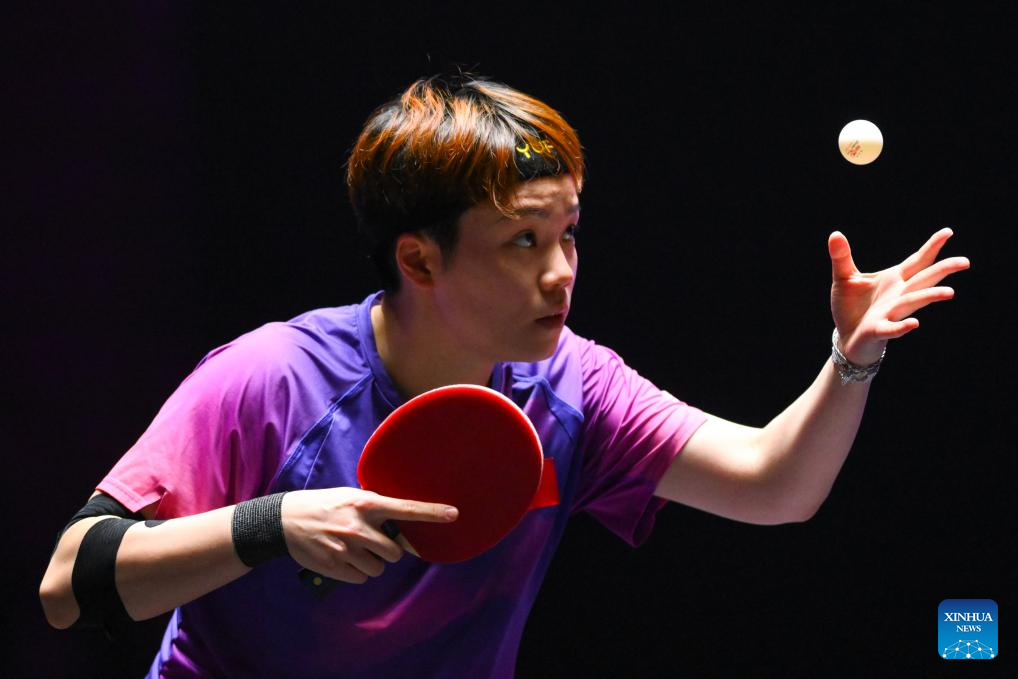 Patrick Franziska of Germany hits a return during the men's singles round of 16 match against Quadri Aruna of Nigeria at the 2025 World Table Tennis (WTT) Champions Macao in Macao, south China, Sept. 12, 2025. (Xinhua/Cheong Kam Ka)