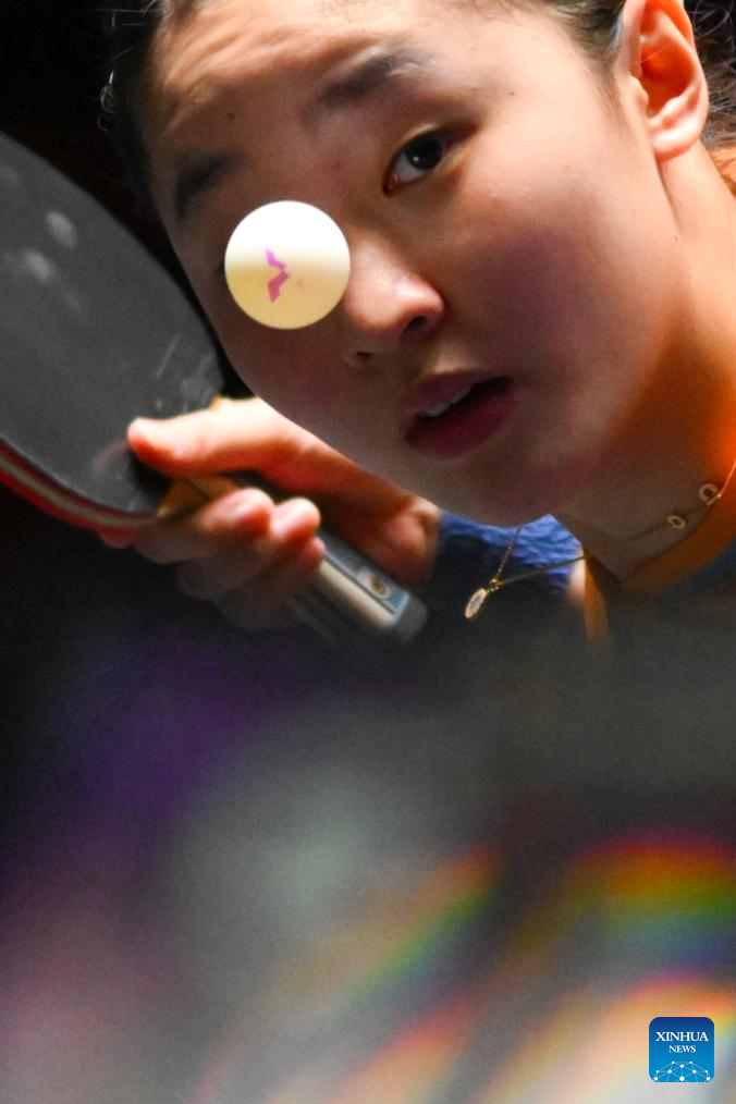 Doo Hoi Kem of China's Hong Kong hits a return during the women's singles round of 16 match against Chen Xingtong of China at the 2025 World Table Tennis (WTT) Champions Macao in Macao, south China, Sept. 12, 2025. (Xinhua/Cheong Kam Ka)