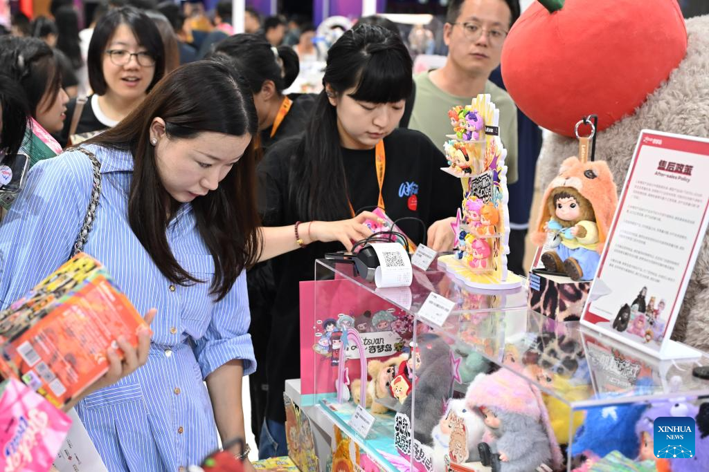 People view cultural and creative products displayed at the 2025 China International Fair for Trade in Services (CIFTIS) in Beijing, capital of China, Sept. 12, 2025. The 2025 CIFTIS is held from Sept. 10 to 14 at the Shougang Park in Beijing. This year's fair features a wide range of cultural and creative products, which are highly popular among visitors. (Xinhua/Shan Yuqi)