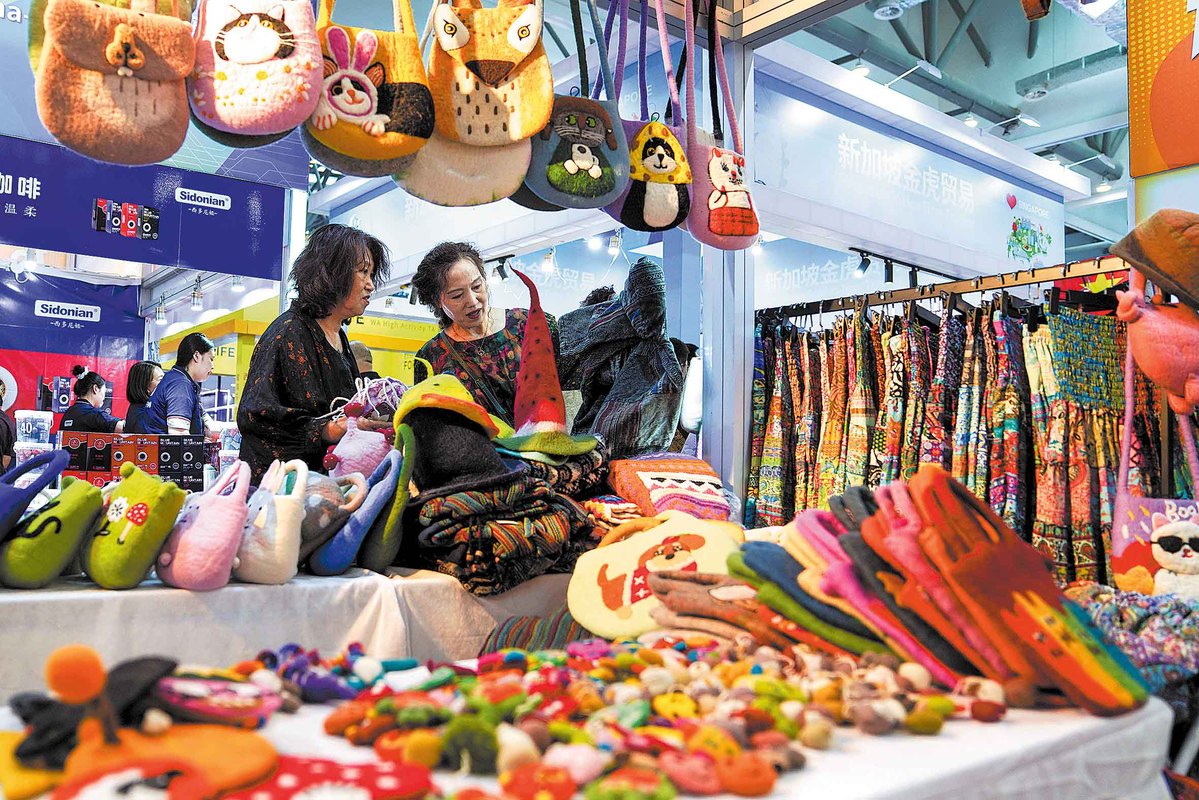 Visitors examine clothing and textile products from Nepal at the expo on Aug 29. Products from over 40 countries and regions were displayed at the event. XU CHANG/XINHUA
