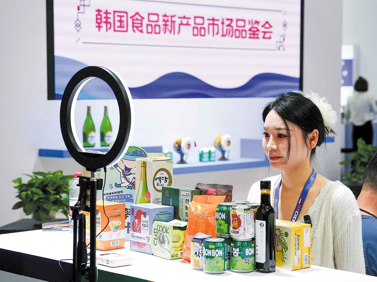 A representative of an exhibitor livestreams from the expo on Aug 27. ZHANG NAN/XINHUA