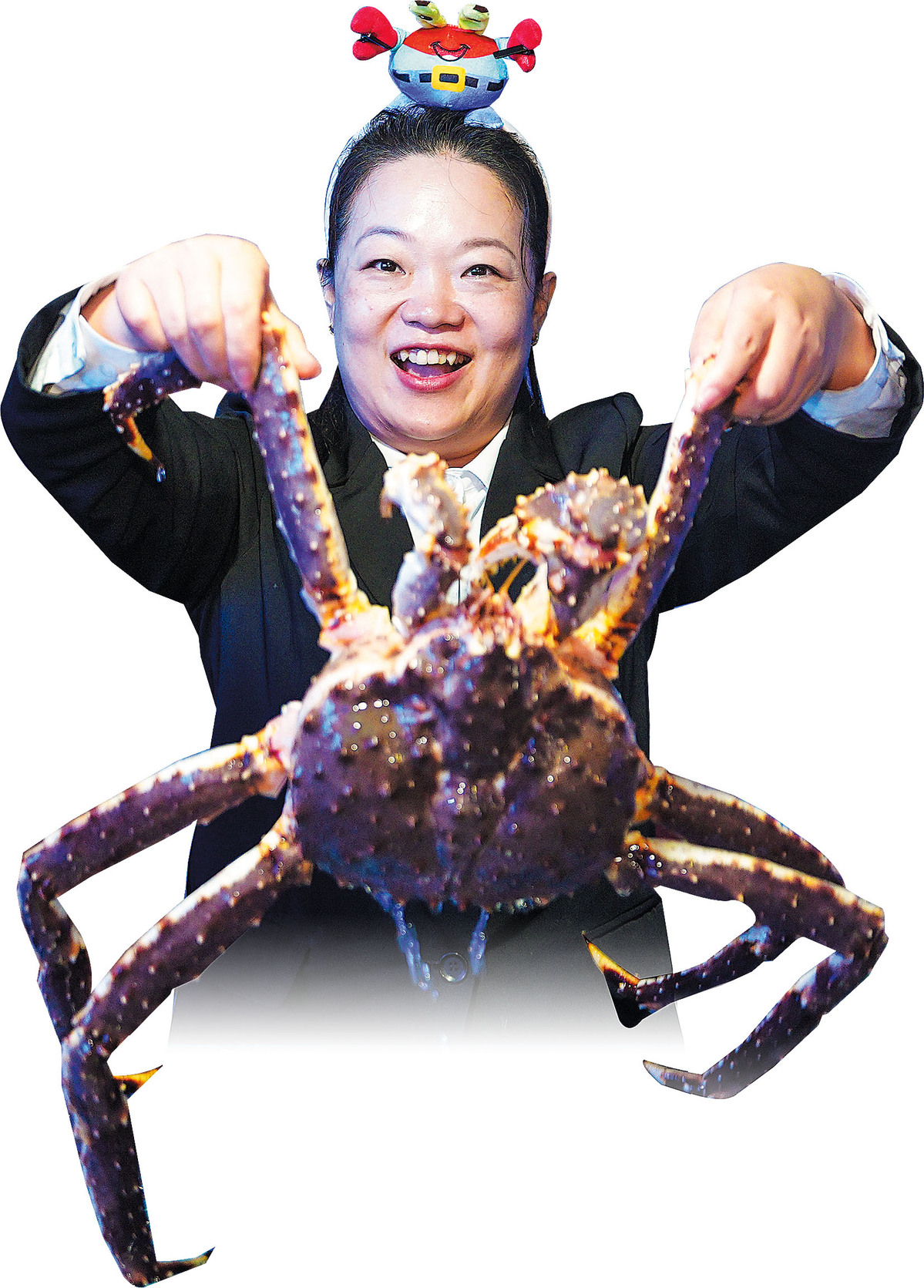 A saleswoman displays a king crab imported from Russia in Hunchun, Jilin province, in September 2024. XU CHANG/XINHUA