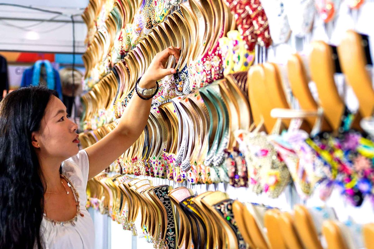 A visitor examines footwear from India at the expo on Aug 29. XU CHANG/XINHUA