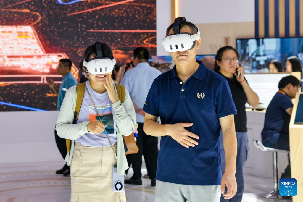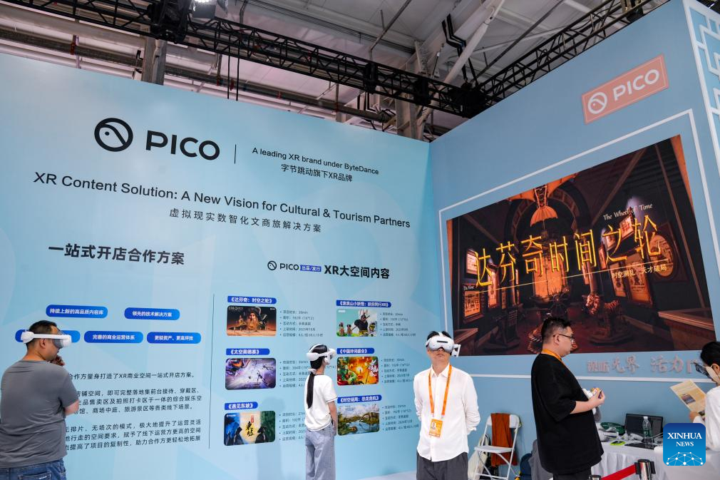 People learn about the XR Content Solution: A New Vision for Cultural & Tourism Partners at the Cultural &Tourism Services exhibition area of the 2025 China International Fair for Trade in Services (CIFTIS) at Shougang Park in Beijing, capital of China, Sept. 12, 2025. At the 2025 CIFTIS, a variety of cutting-edge technologies have enriched the exhibition, providing more interactive and immersing cultural and tourism experiences for visitors. (Xinhua/Xu Qin)