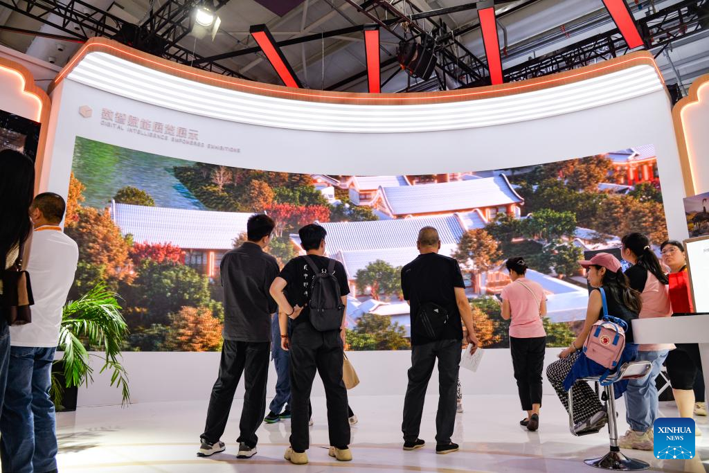 People visit the digital intelligence empowered exhibitions at the Cultural & Tourism Services exhibition area of the 2025 China International Fair for Trade in Services (CIFTIS) at Shougang Park in Beijing, capital of China, Sept. 13, 2025. At the 2025 CIFTIS, a variety of cutting-edge technologies have enriched the exhibition, providing more interactive and immersing cultural and tourism experiences for visitors. (Xinhua/Xu Qin)