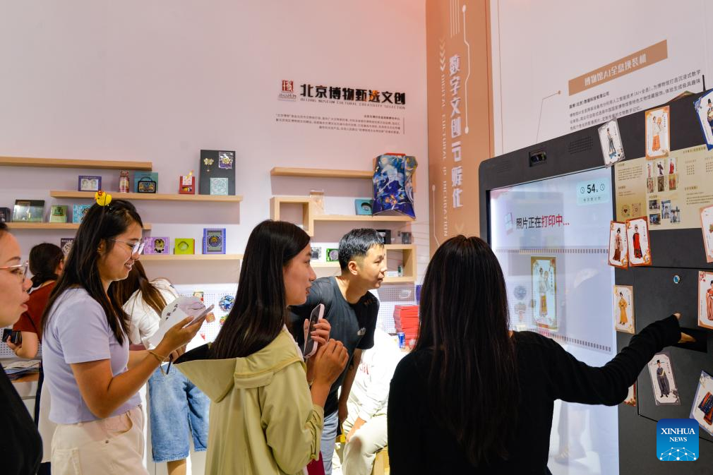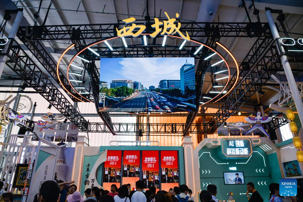 People visit the booth of Xicheng District of Beijing at the Cultural & Tourism Services exhibition area of the 2025 China International Fair for Trade in Services (CIFTIS) at Shougang Park in Beijing, capital of China, Sept. 13, 2025. At the 2025 CIFTIS, a variety of cutting-edge technologies have enriched the exhibition, providing more interactive and immersing cultural and tourism experiences for visitors. (Xinhua/Xu Qin)