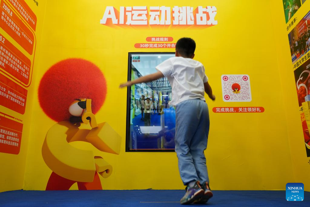 A kid experiences AI sports challenge at the Sports Services exhibition area of the 2025 China International Fair for Trade in Services (CIFTIS) at Shougang Park in Beijing, capital of China, Sept. 13, 2025. At the 2025 CIFTIS, a variety of cutting-edge technologies have enriched the exhibition, providing more interactive and immersing cultural and tourism experiences for visitors. (Xinhua/Zhou Tinglu)
