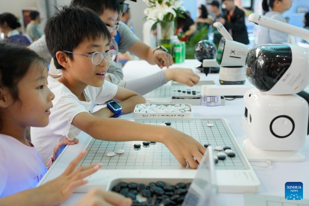 Kids play gobang with robots at the Cultural & Tourism Services exhibition area of the 2025 China International Fair for Trade in Services (CIFTIS) at Shougang Park in Beijing, capital of China, Sept. 13, 2025. At the 2025 CIFTIS, a variety of cutting-edge technologies have enriched the exhibition, providing more interactive and immersing cultural and tourism experiences for visitors. (Xinhua/Zhou Tinglu)