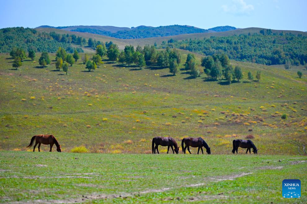 Horses forage on the Ulan Butong grassland in Hexigten Banner of Chifeng, north China's Inner Mongolia Autonomous Region, Sept. 12, 2025. (Xinhua/Peng Yuan)