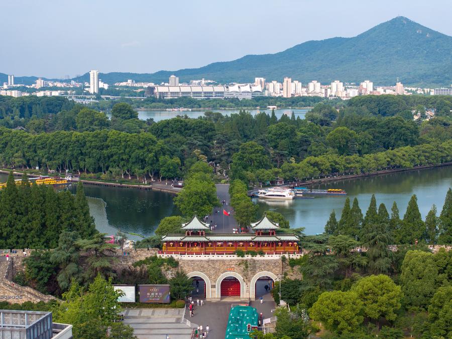 This aerial photo taken on June 13, 2023 shows the city wall of Ming Dynasty (1368-1644), Xuanwu Lake and Zijin Mountain in Nanjing, east China's Jiangsu Province. (Xinhua/Li Bo)