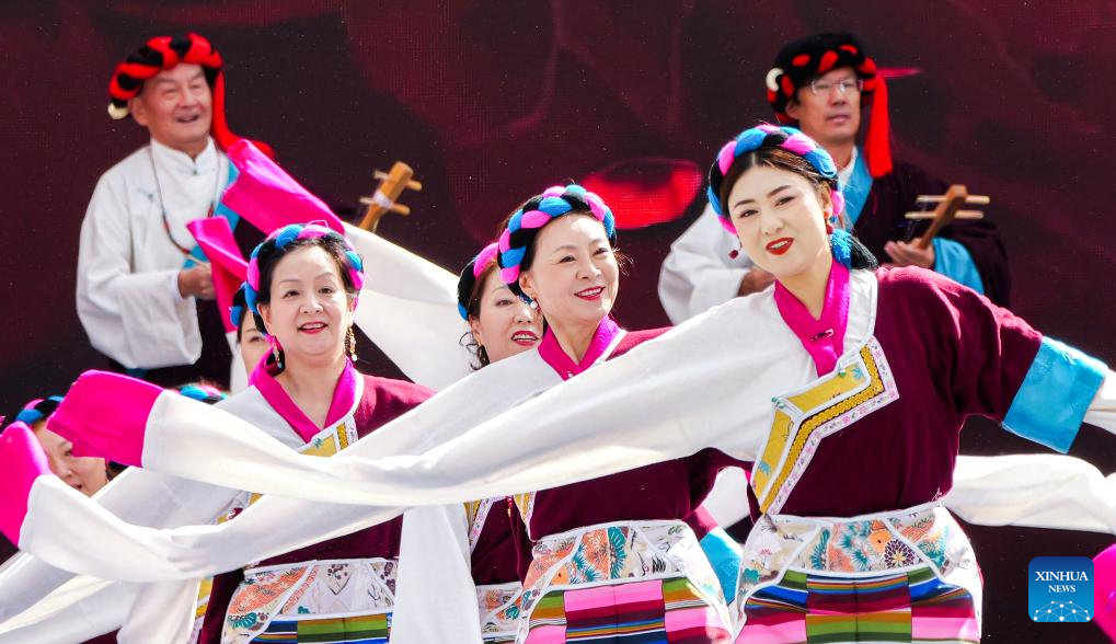 Performers dance during the opening ceremony of a culture and arts festival themed on the ancient Tea Horse Road in Qamdo, southwest China's Xizang Autonomous Region, Sept. 15, 2025. Qamdo used to be a key stop along the ancient Tea Horse Road, a trade route which dates back to the Tang Dynasty (618-907) and spans multiple regions. (Xinhua/Kelsang Namgyai)