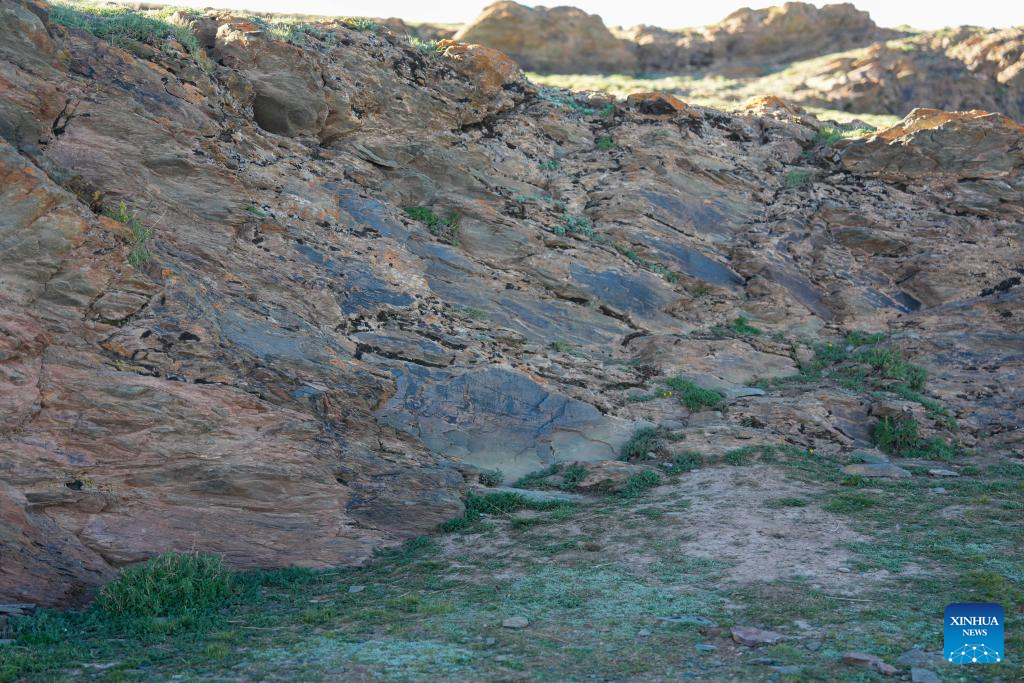 This photo taken on July 25, 2025 shows the Qin Dynasty engraved stone discovered on the northern shore of Gyaring Lake in Maduo County, northwest China's Qinghai Province. (Xinhua/Du Xiaowei)