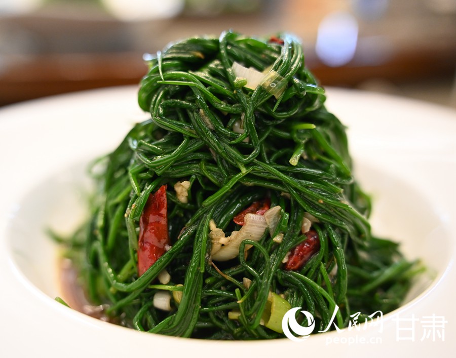 Photo shows a dish made with wild onions in Minqin county, Wuwei city, northwest China's Gansu Province. (People's Daily Online/Shao Lan)