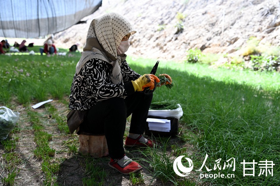 A worker harvests wild onions in Minqin county, Wuwei city, northwest China's Gansu Province. (People's Daily Online/Xi Juanjuan)