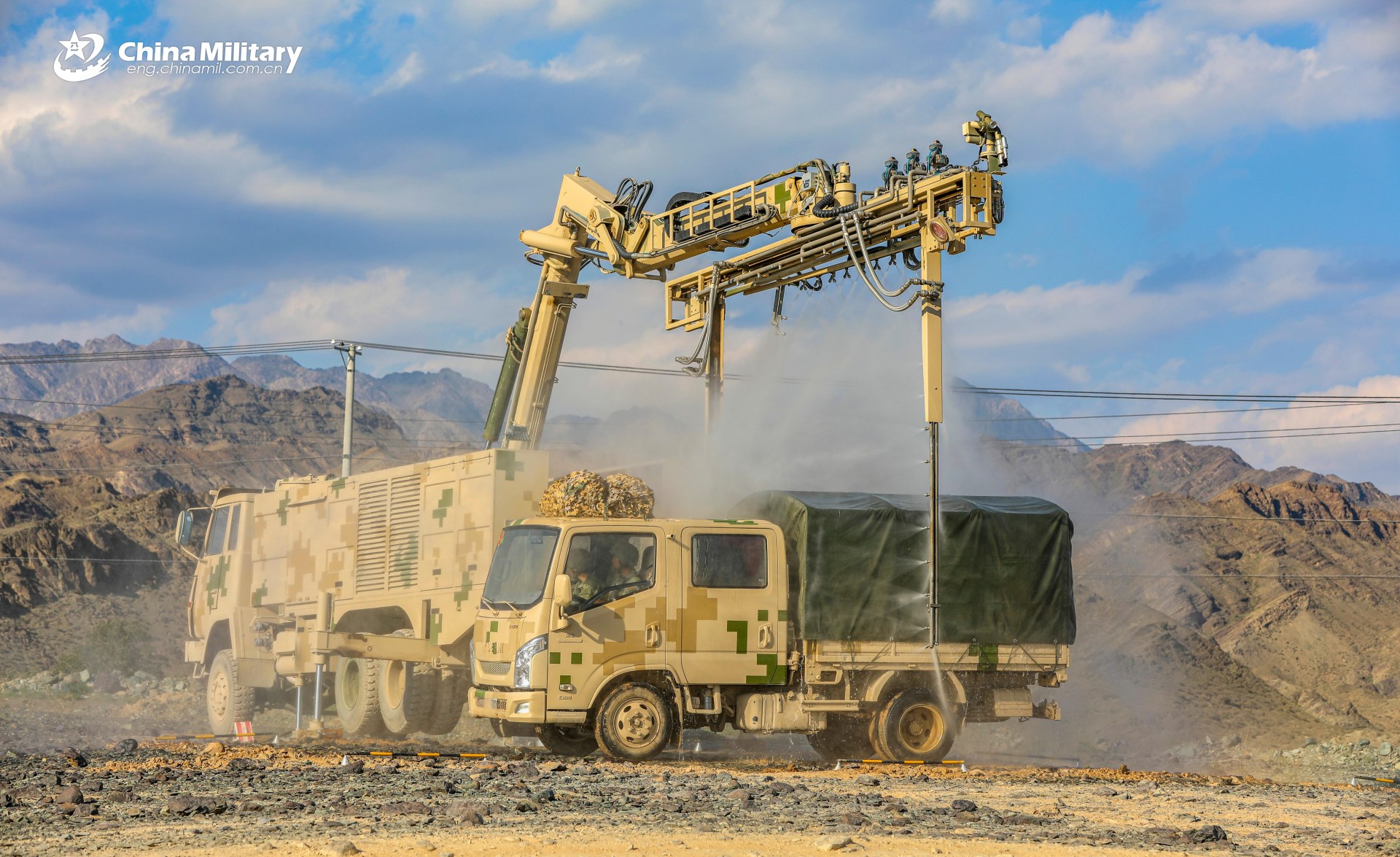 A decontamination vehicle attached to a chemical defense and reconnaissance unit under the Chinese PLA Army decontaminates a contaminated vehicle during a chemical defense training exercise in recent days. (eng.chinamil.com.cn/Photo by Zhang Yuliang and Zeng Cunjun)