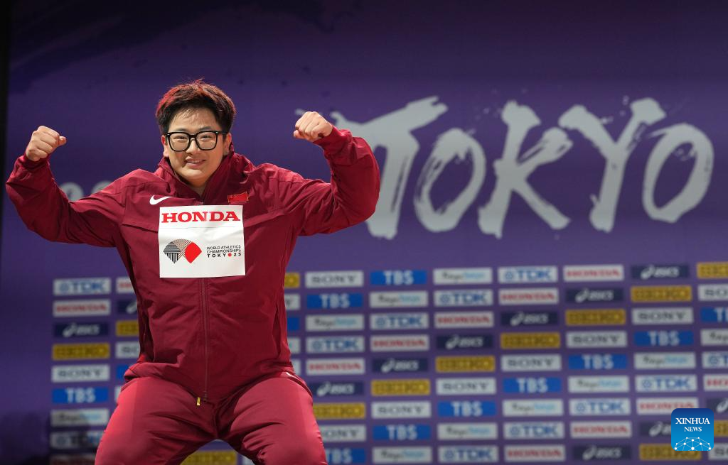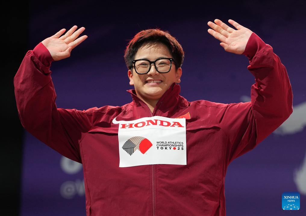 Silver medalist Zhao Jie of China poses during the awarding ceremony of the women's hammer throw final at the 2025 World Athletics Championships in Tokyo, Japan, Sept. 16, 2025. (Xinhua/Jiang Han)