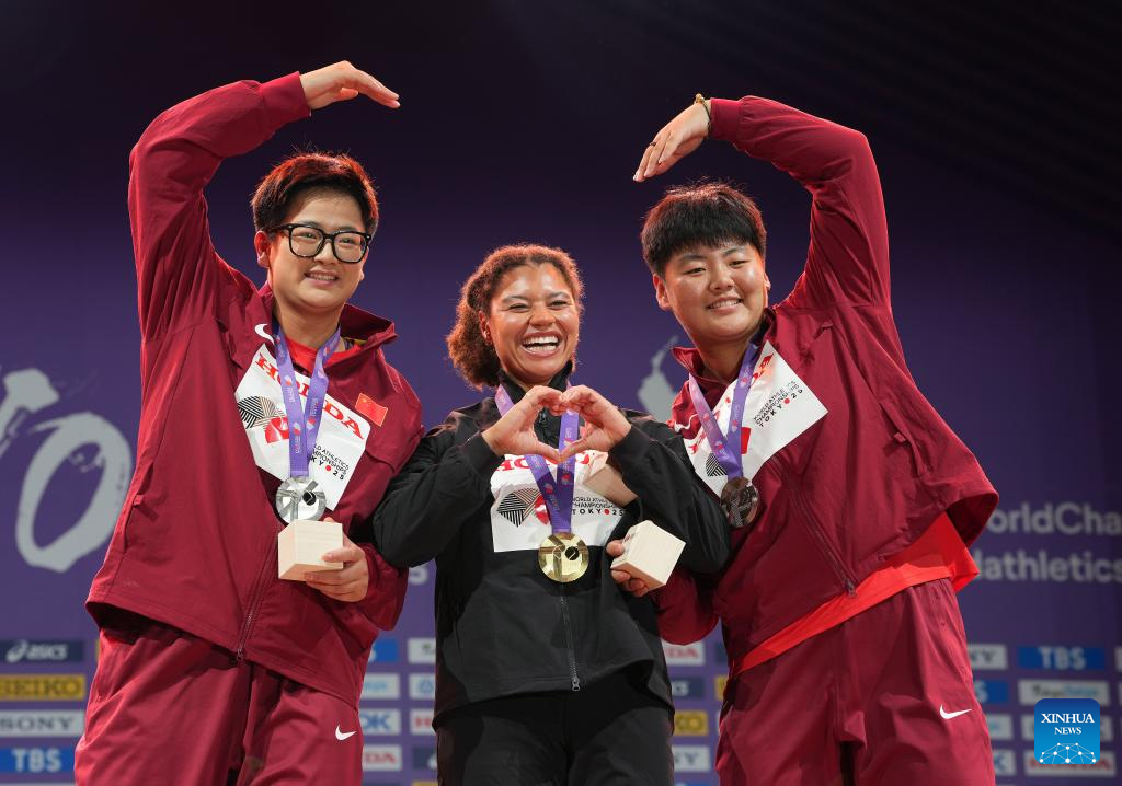 Gold medalist Camryn Rogers (C) of Canada, silver medalist Zhao Jie (L) and bronze medalist Zhang Jiale of China pose during the awarding ceremony of the women's hammer throw final at the 2025 World Athletics Championships in Tokyo, Japan, Sept. 16, 2025. (Xinhua/Jiang Han)