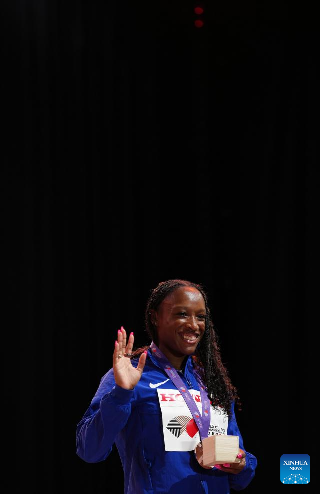 Bronze medalist Grace Stark of the United States is seen during the women's 100m hurdles awarding ceremony at the 2025 World Athletics Championships in Tokyo, Japan, Sept. 16, 2025. (Xinhua/Jiang Han)