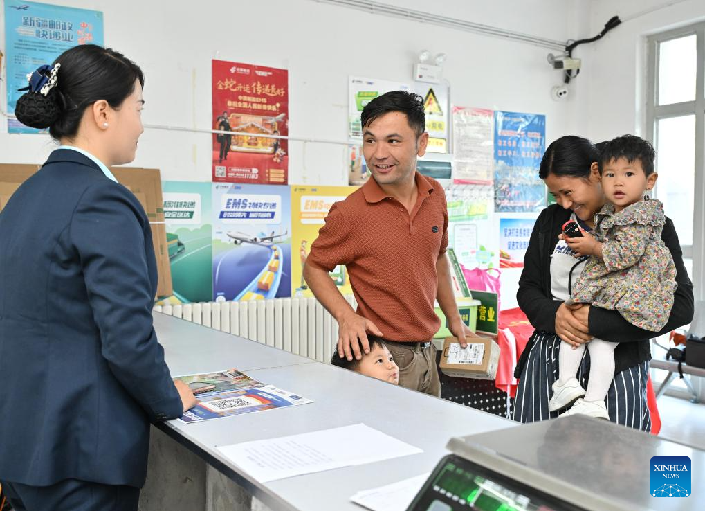 A villager (2nd, L) picks up a parcel with his family at a post office in Miliangquan Village, Ili Kazak Autonomous Prefecture, northwest China's Xinjiang Uygur Autonomous Region, Sept. 8, 2025. In recent years, China Post Ili Branch has cooperated with local bus system to deliver parcels. In recent years, the Xinjiang Branch of China Post has extended its postal services to local communities of remote area and border outposts. Additionally, it has built a high-quality agricultural product supply chain across the region, facilitating the sales of local premium agricultural products and contributing to rural revitalization.