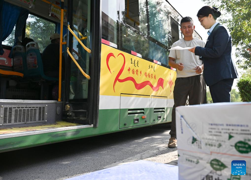 A bus driver hands over parcels to a staff member (R) of a post office in Miliangquan Village, Ili Kazak Autonomous Prefecture, northwest China's Xinjiang Uygur Autonomous Region, Sept. 8, 2025. In recent years, China Post Ili Branch has cooperated with local bus system to deliver parcels. In recent years, the Xinjiang Branch of China Post has extended its postal services to local communities of remote area and border outposts. Additionally, it has built a high-quality agricultural product supply chain across the region, facilitating the sales of local premium agricultural products and contributing to rural revitalization.