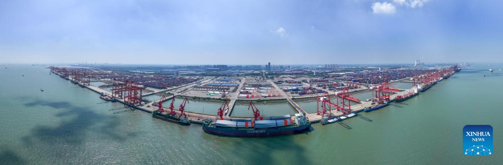 A stitched aerial drone photo taken on Sept. 16, 2025 shows vessels docking at Taicang Port in east China's Jiangsu Province. According to the management committee of the Taicang Port, from January to August 2025, container throughput at Taicang Port reached 5.8 million twenty-foot equivalent units (TEUs), an increase of 2.2 percent year on year, and the cargo throughput of the port reached 199 million tonnes, marking a year-on-year increase of 7.9 percent. (Xinhua/Li Bo)