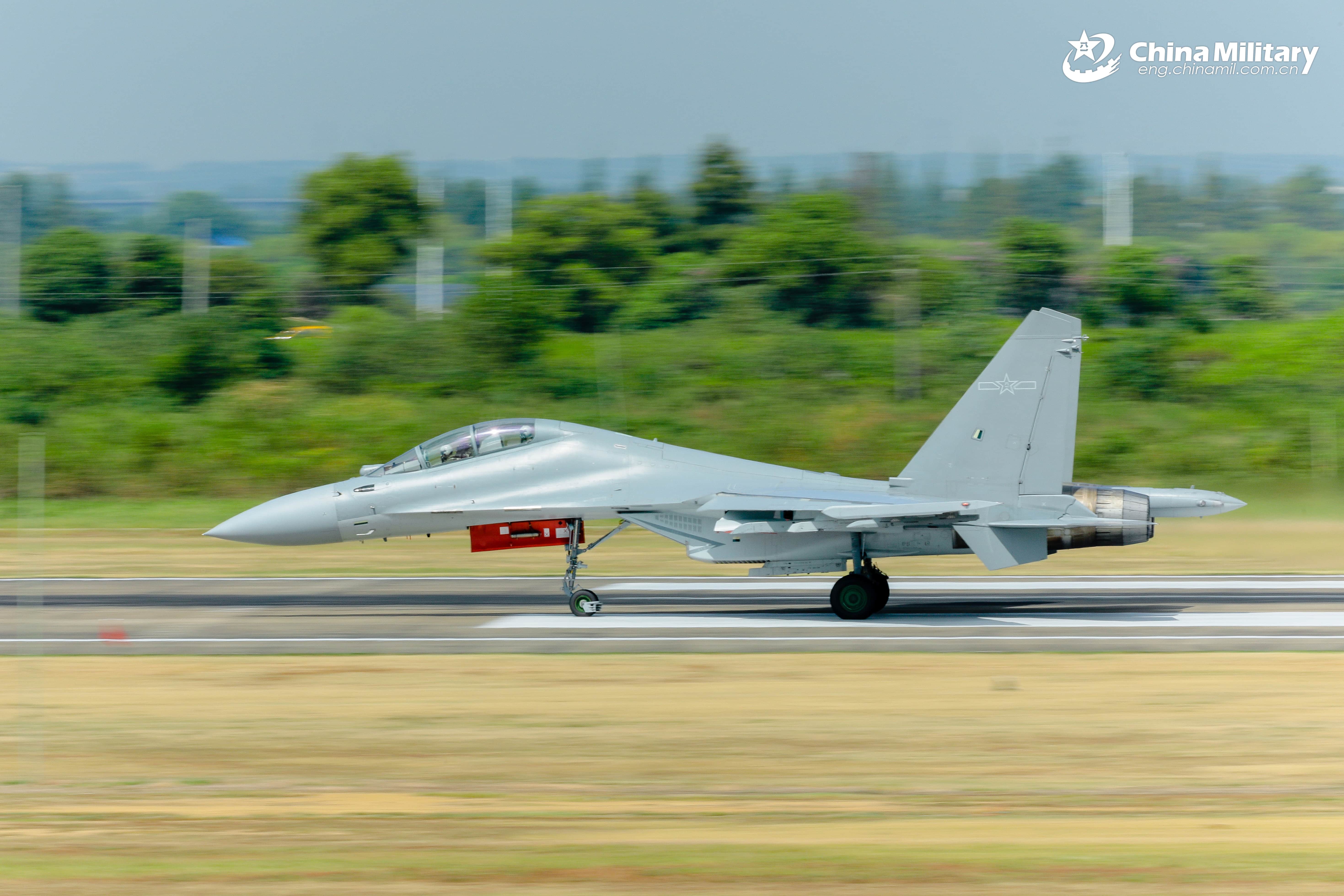 A J-16 fighter jet attached to an aviation brigade under the Chinese PLA Air Force accelerates on the runway before takeoff during a flight training exercise. (eng.chinamil.com.cn/Photo by Wang Yijie)