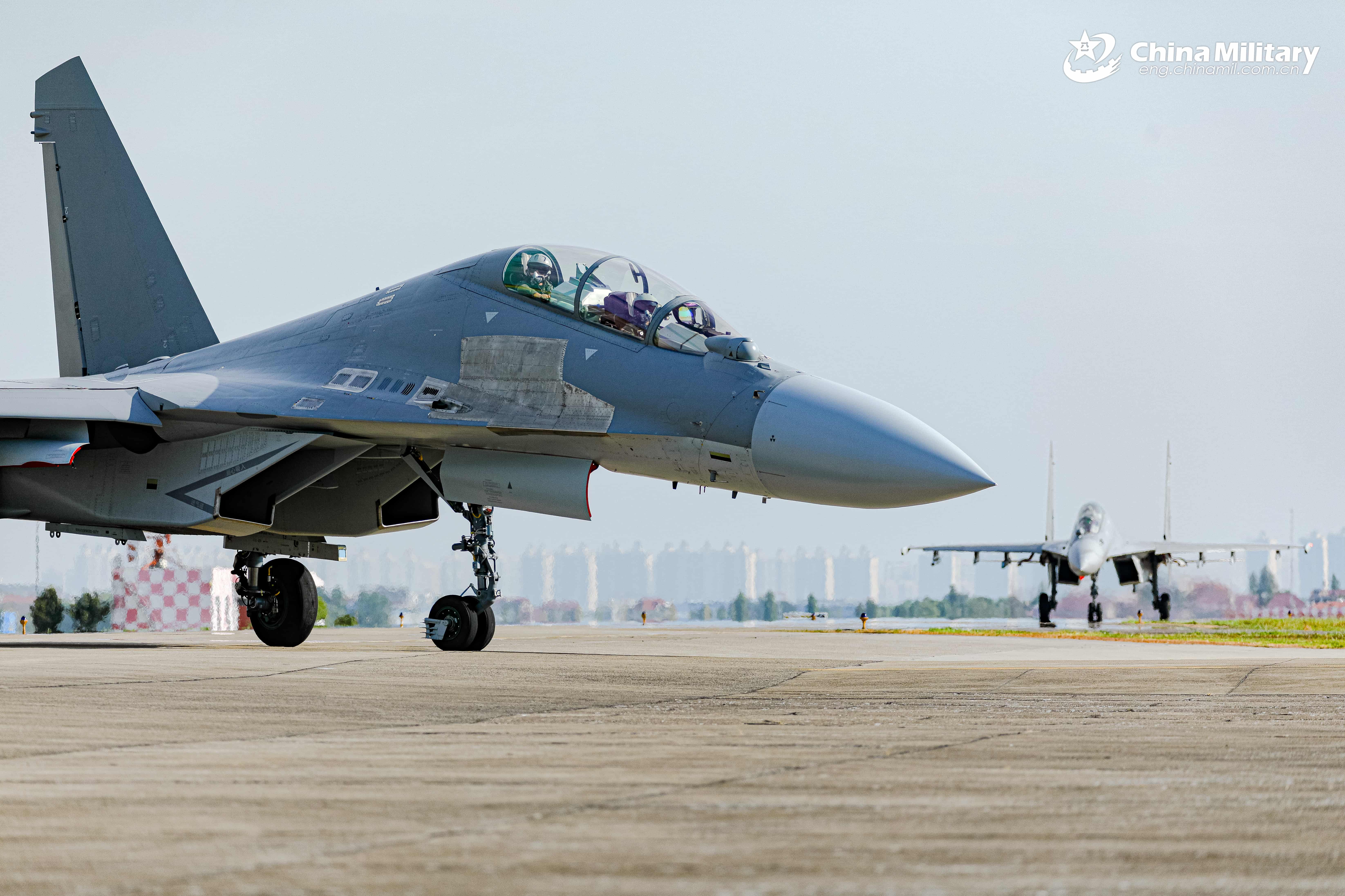 Two J-16 fighter jets attached to an aviation brigade under the Chinese PLA Air Force taxi on the runway during a flight training exercise. (eng.chinamil.com.cn/Photo by Wang Yijie)