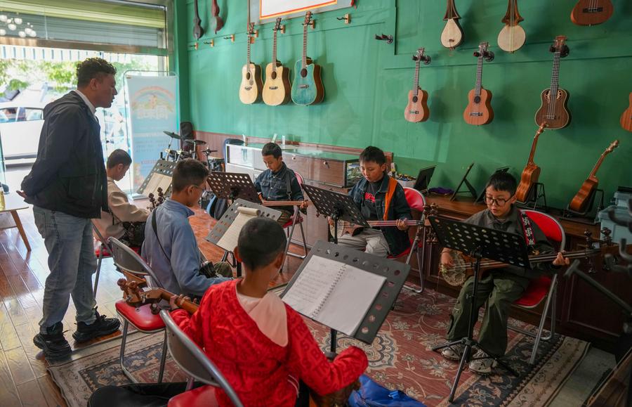 Children play Zhanian, a traditional Tibetan stringed instrument, at a musical instrument store in Lhasa, southwest China's Xizang Autonomous Region, Sept. 13, 2025. (Xinhua/Jigme Dorje)