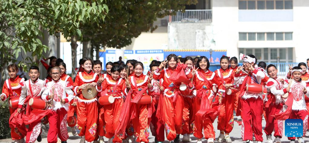 Students participate in a campus activity at Kunshan Yucai School in Artux City, Kizilsu Kirgiz Autonomous Prefecture, northwest China's Xinjiang Uygur Autonomous Region, Sept. 12, 2025. The school, with a nine-year school system, was built in 2008 in Kizilsu Kirgiz Autonomous Prefecture. Its beautiful campus and rich teaching activities help children grow up healthily and happily. (Xinhua/Cheng Li)