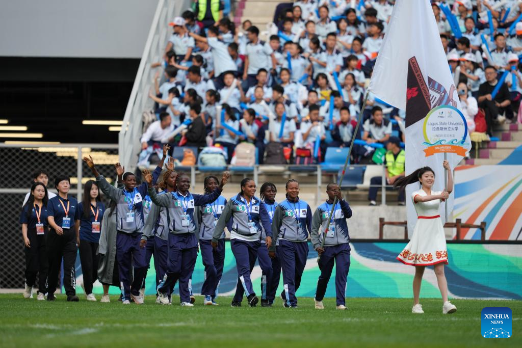 Delegation of Lagos State University from Nigeria parade during the opening ceremony of the 2025 FISU University World Cup Football held in Suoyuwan Stadium in Dalian, northeast China's Liaoning Province, Sept. 17, 2025. (Xinhua/Zheng Huansong)