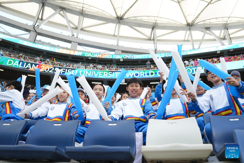 Spectators cheer prior to the opening ceremony of the 2025 FISU University World Cup Football held in Suoyuwan Stadium in Dalian, northeast China's Liaoning Province, Sept. 17, 2025. (Xinhua/Zheng Huansong)