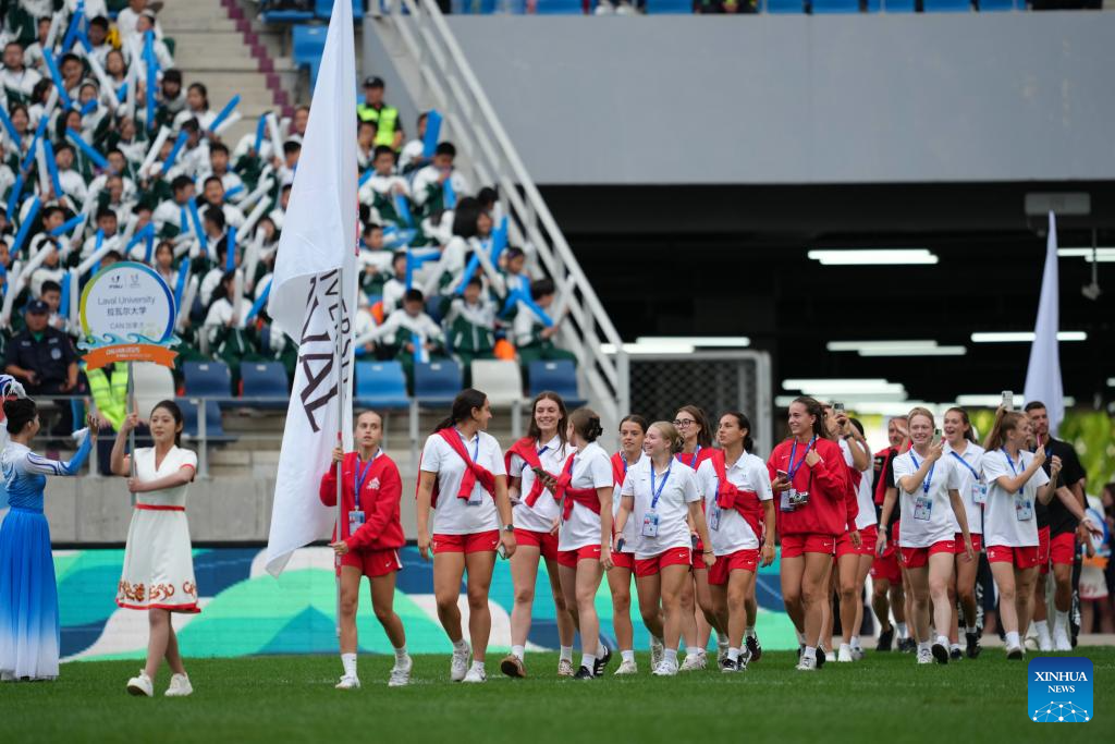 Delegation of Laval University from Canada parade during the opening ceremony of the 2025 FISU University World Cup Football held in Suoyuwan Stadium in Dalian, northeast China's Liaoning Province, Sept. 17, 2025. (Xinhua/Zheng Huansong)