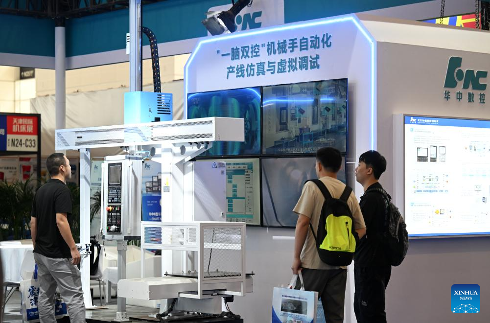 People learn about a machine tool at the National Convention and Exhibition Center (Tianjin) in north China's Tianjin Municipality, Sept. 17, 2025. The Tianjin International Machine Tool Exhibition kicked off at the National Convention and Exhibition Center (Tianjin) on Wednesday and will last till Sept. 20. An international exhibition on industrial automation and robotics is held here concurrently. (Xinhua/Zhao Zishuo)