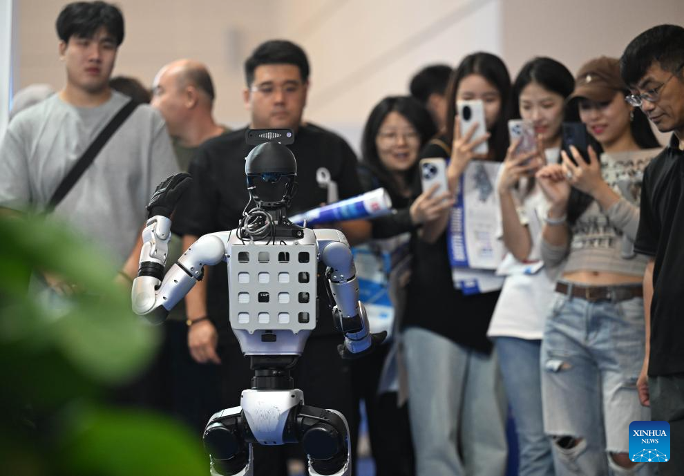 People view a humanoid robot at the National Convention and Exhibition Center (Tianjin) in north China's Tianjin Municipality, Sept. 17, 2025. The Tianjin International Machine Tool Exhibition kicked off at the National Convention and Exhibition Center (Tianjin) on Wednesday and will last till Sept. 20. An international exhibition on industrial automation and robotics is held here concurrently. (Xinhua/Zhao Zishuo)